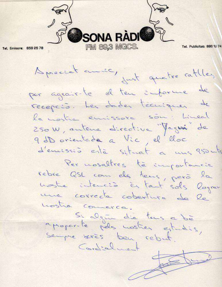 Carta de resposta de l’emissora Osona Ràdio a un oïdor que els va enviar un informe de recepció. L’emissora va emetre des de Can Putelles, Sobremunt (Osona) a la freqüència de 89.3 FM entre els anys 1984 i 1986 aproximadament. La carta és signada per Joan Turró, director de l’emissora.