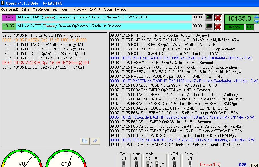 Fins ara, tots els modes de dades digitals requereixen la modulació de la portadora de transmissió, ja sigui per canvis de freqüència, fase o amplitud. Aquest mode utilitza només els estats d’encès/apagat de manipulació i permet arribar a tot el món amb potències extremadament baixes com, per exemple, 100 mW. A la part esquerra de la imatge podeu veure diferents estacions rebudes a la freqüència de 10.135 kHz. banda de 30 metres, una d’elles d’Austràlia, VK2DGH, emetent només amb 5 watts de potència. (Descàrrega del programa OPERA fent clic aquí)