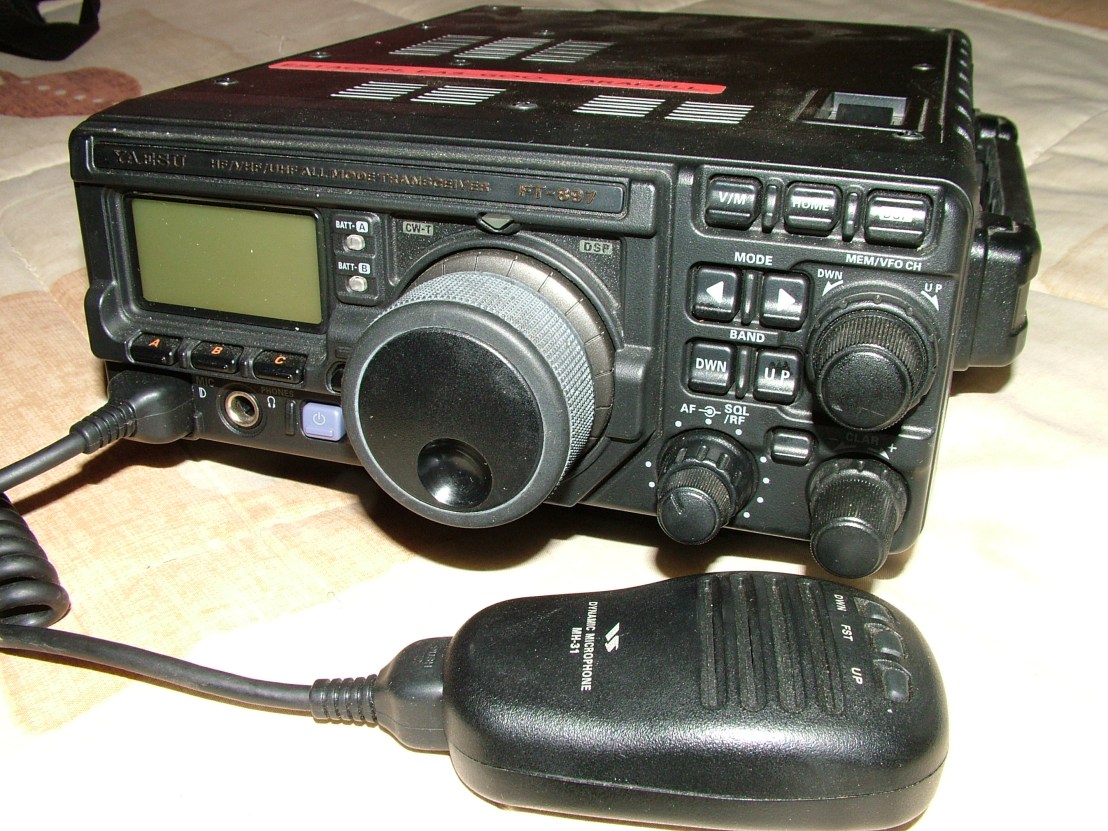 Transceptor YAESU FT-897 molt compacte, ideal per a operacions en mòbil i portable. És un equip amb totes les bandes decamètriques (HF) més 50, 144 i 430 Mhz. (VHF i UHF). La potència és de 100 W. a totes les bandes d’HF i 50 Mhz. A la banda de VHF és de 50 W. i a la d’UHF és de 20 W. S’hi pot instal·lar un sintonitzador d’antena a la part esquerra de l’aparell i una font d’alimentació a dintre del mateix equip. També pot funcionar amb bateries.