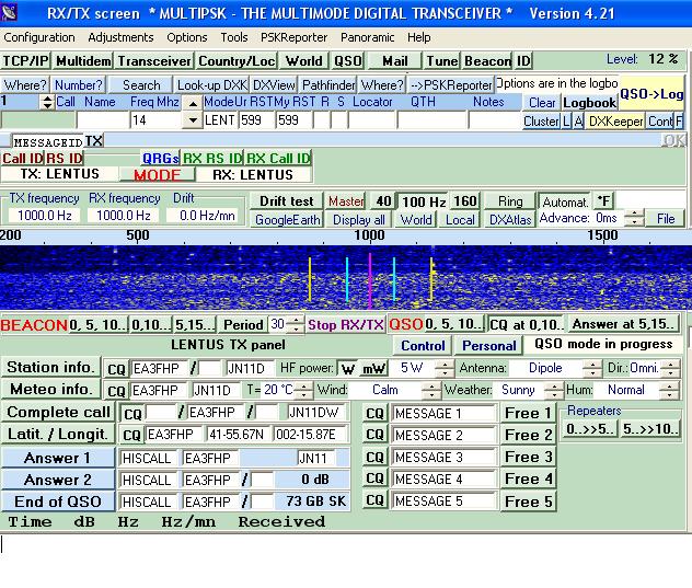 El nou mode digital LENTUS permet comunicacions a llarga distància amb potències molt baixes, de 5 W. o menys. És un mode creat per F6CTE l’autor del programa MULTIPSK que incorpora molts modes digitals, alguns força rars i desconeguts. La transmissió de cada trama de LENTUS dura cinc minuts, per tant és impossible emetre amb potències altes perquè no hi ha cap equip que suporti tanta estona una emissió de portadora contínua sense cap interrupció. És una mica semblant al JT65 i a l’ÒPERA.