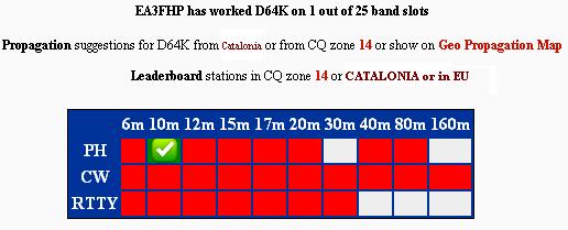 Avui, l’estació EA3FHP ha contactat amb D64K de les Illes Comores. El comunicat s’ha fet a 28.470 kHz. i el senyal real de recepció de l’estació D64K a Catalunya a les 15:22 UTC era de 59 amb una mica de QSB. També cal destacar que l’estació EA3FRI va contactar amb aquestes illes amb només 15 W. de potència però ajudat per una antena cúbica monobanda de quatre elements per a la banda de 10 m. Aquesta expedició DX ha estat activa des d’aquesta illa del 8 al 21 d’agost de 2012.