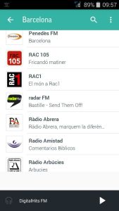 Avui dia tenim la possibilitat d’escoltar emissores de ràdio de tot el món a través de la xarxa gràcies a les diverses aplicacions de mòbil que existeixen. Una APP que funciona molt bé és TuneIn on hi trobarem més de 100.000 d’emissores de temàtiques diverses. Les podem buscar per ubicació, nom, estil de música, notícies, esports, llengua, ràdio local, etc. Això ens dóna la possibilitat d’escoltar emissores que no arriben a casa nostra a través de l’FM analògica. A la fotografia podem veure Digital Hits FM (Osona 95.7 FM) sintonitzada al mòbil amb aquesta aplicació i la podem sentir amb qualitat MP3 a 128 kbps.