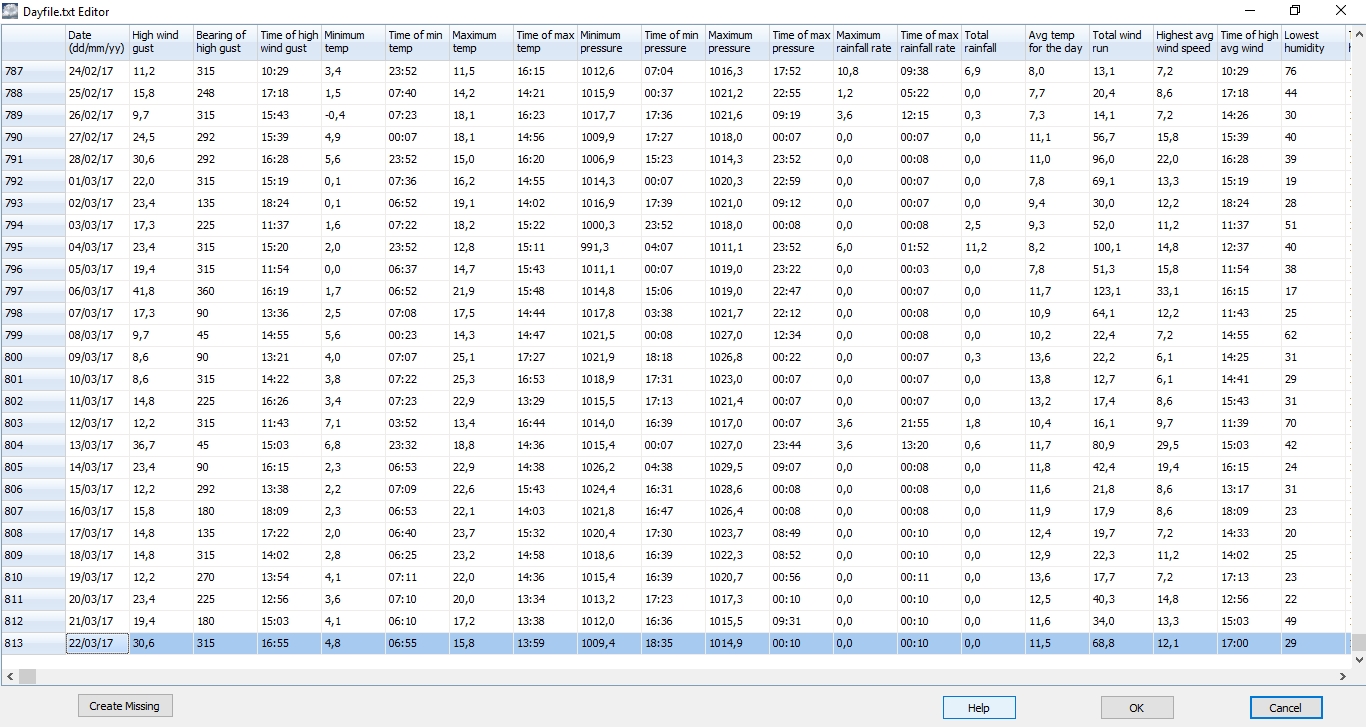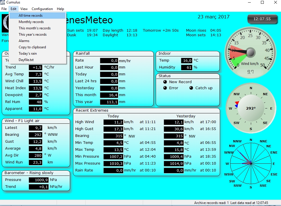 En els fòrums de meteorologia trobem molta informació sobre com editar les dades meteorològiques del programari “Cumulus”, però a vegades són confuses o no són del tot correctes. Editar les dades o corregir algun error del “Cumulus”, és molt més ràpid, senzill i fàcil del que sembla. La llibreta principal on es desen les dades i que és la que hem d’editar sempre, és la que porta per nom “Dayfile”. Per tant, si el dia d’avui ens entra algun error de l’estació meteorològica, per exemple 60º de temperatura o 300 km/h de vent, el primer que farem serà corregir l’error comprovant les quatre llibretes següents anant al menú “Edit” del “Cumulus”: