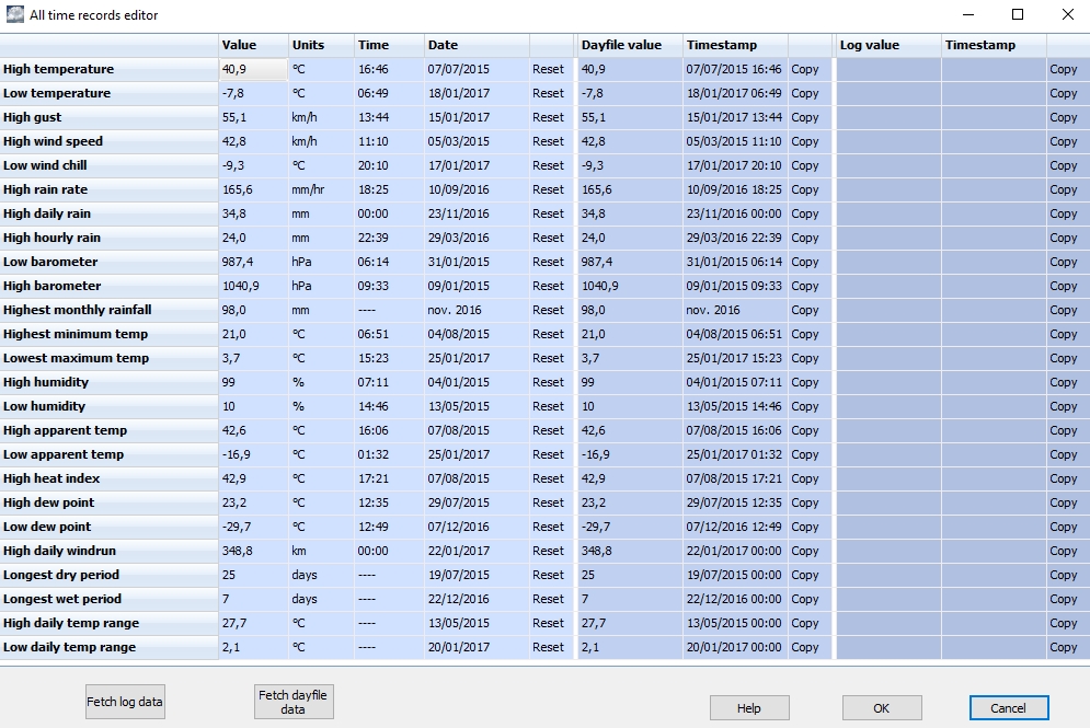 Amb la pantalla oberta “All time records” clicarem el menú “Fetch dayfile data” i ens apareixeran a la columna de la dreta anomenada “Dayfile value” tots els valors extrems i correctes que hi havien abans de produir-se l’error. A la columna de l’esquerra veurem l’error enregistrat (exemple: temperatura 60º). Per a corregir l’error, clicarem la tecla “Copy” del “Dayfile value” (exemple: temperatura 35º) i aquest valor correcte quedarà traspassat a l’esquerra, a la llibreta “All time records“.