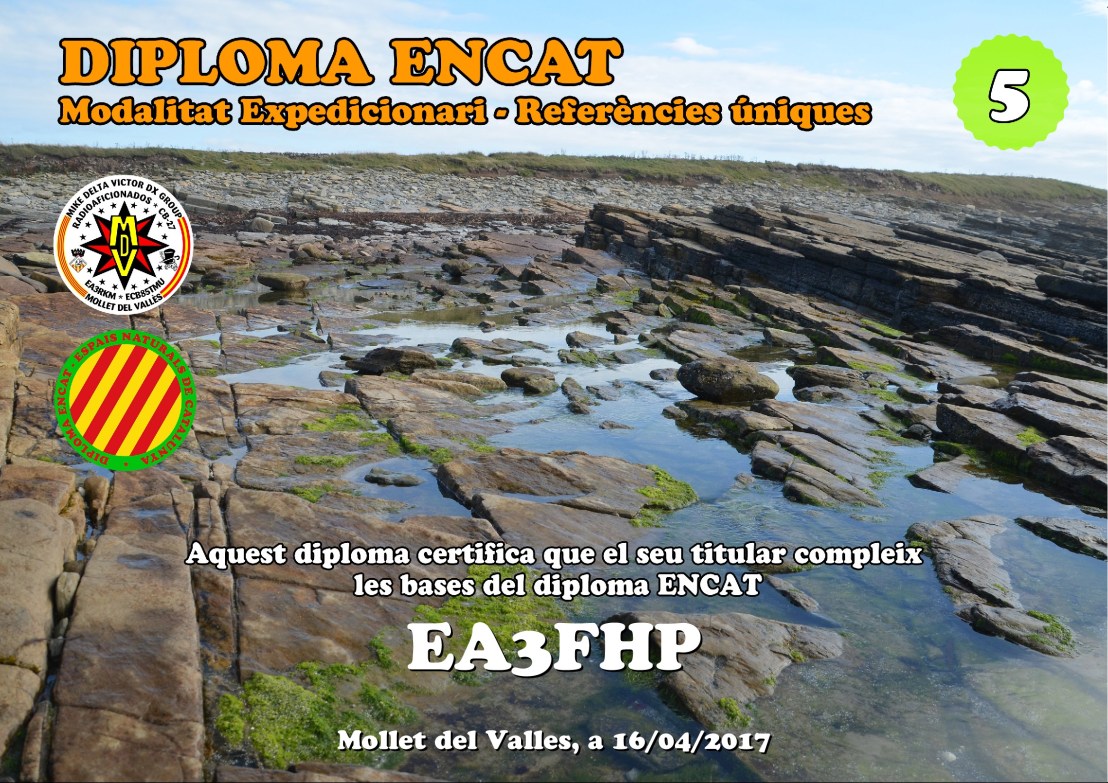 EA3FHP obté el diploma Espais naturals de Catalunya (ENCAT) en la modalitat d’expedicionari per haver activat cinc referències diferents.