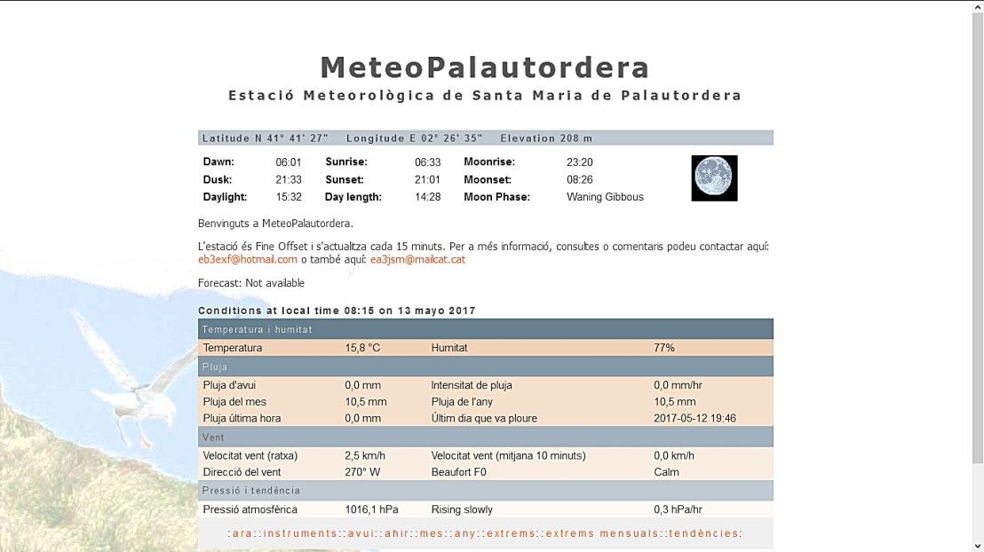 EA3JSM (Joan) ha posat en funcionament el web MeteoPalautordera on s’hi envien les dades de l’estació meteorològica de Santa Maria de Palautordera (Vallès Oriental). Les dades també les podeu consultar a Meteoclimatic.