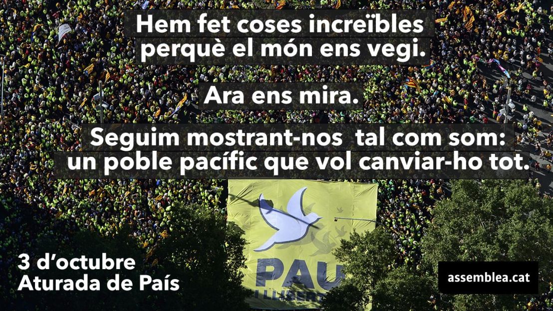 Hem de mantenir entre tots la pau social al país. Haurem de fer de pacificadors per uns dies i vigilar, reprovar i aturar qualsevol inici de violència. És vital per a la nostra victòria. La policia espanyola està infiltrada en les mobilitzacions i en seran els instigadors!