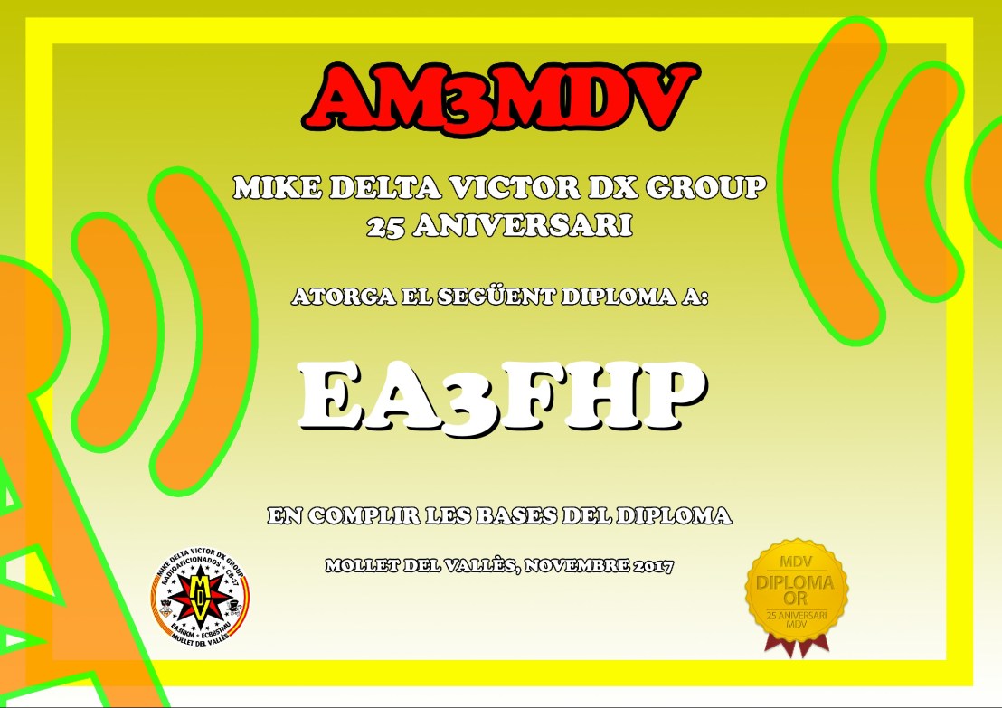 Diplomes atorgats a EA3FHP amb motiu del 25è aniversari de Mike Delta Victor DX Group Per molts anys! Gràcies a Mike Delta Victor DX Group, una associació de casa nostra. Relacionats Radioaficionats