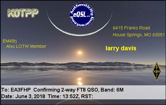 El mode digital FT8 permet fer comunicats extraordinaris com aquest, entre Catalunya i els Estats Units, a 50.313 MHz (banda de 6 m) i amb 10 watts de potència. Aquest sistema està tenint una acceptació mai aconseguida per cap altre mode digital malgrat que hi ha una minoria de radioaficionats que estan en contra d’ell argumentant que no té mèrit treballar gran quantitat de països amb molt poc temps. | Descàrrega del programa JTDX