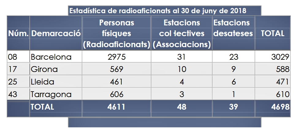 Augmenta el nombre de radioaficionats a Catalunya En només 3 mesos, del 30 de juny fins al 30 de setembre de 2018, hi ha hagut un increment de 12 autoritzacions de radioaficionat noves. Autoritzacions de radioaficionat vigents fins al 30 de setembre de 2018 Autoritzacions de radioaficionat vigents fins al 30 de juny de 2018 Relacionats Radioaficionats