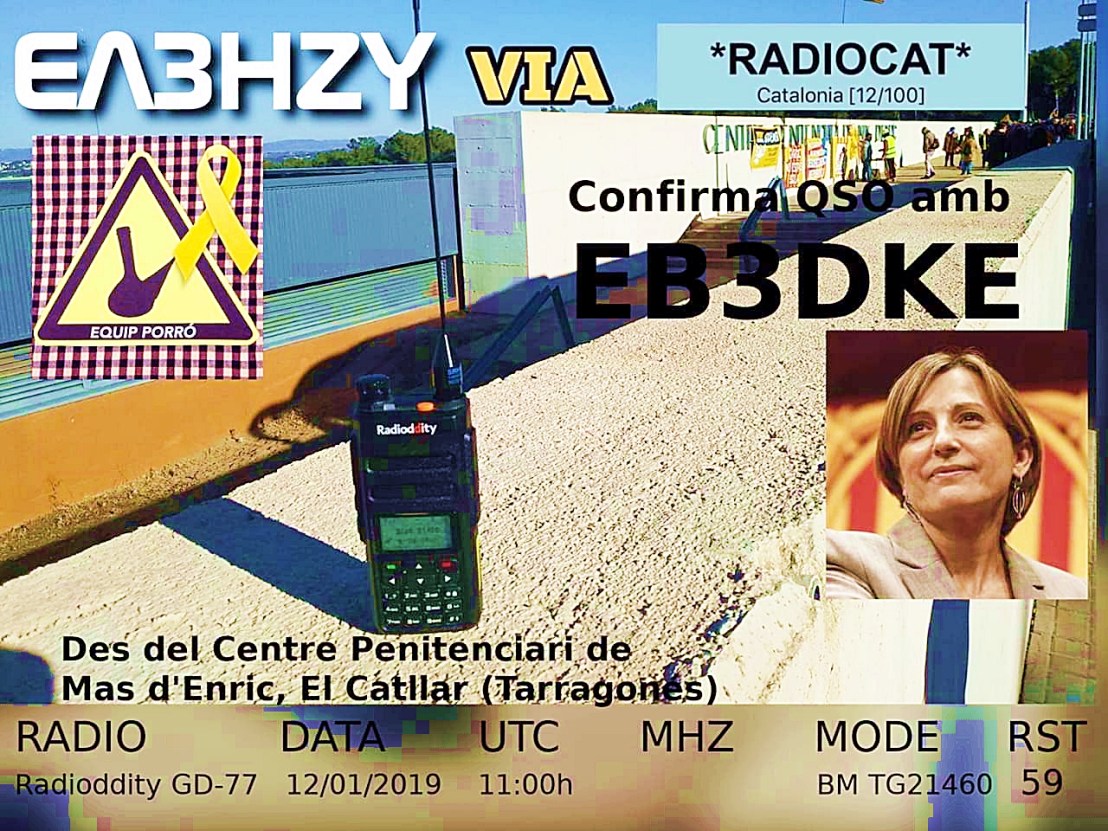 Ahir, el radioaficionat vilanoví EA3HZY, es va desplaçar al centre penitenciari de Mas d’Enric, El Catllar (Tarragonès) per emetre des d’allà i realitzar comunicats amb altres radioaficionats i per donar suport a la Molt Honorable Sra. Carme Forcadell, 14a presidenta del Parlament de Catalunya. #Llibertatpresospolítics #FreeCatalanPoliticalPrisoners