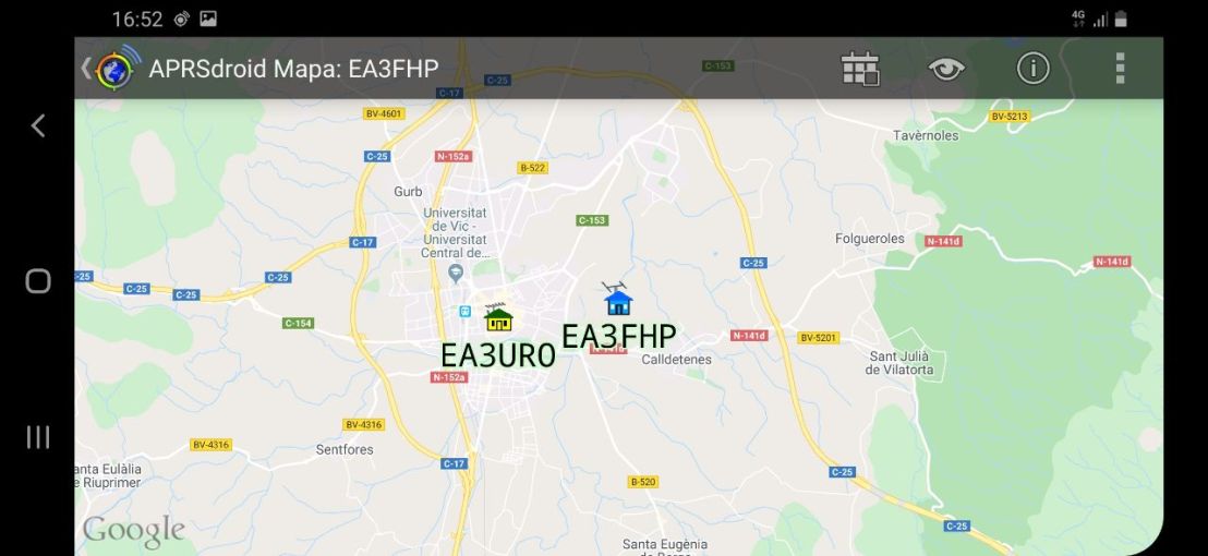 EA3FHP (radioaficionat i estació meteorològica) i EA3URO (Unió de Radioafeccionats d’Osona) emetent amb el mode digital APRS (Automatic Position Reporting System) via ràdio a 144.800 Mhz. amb l’equip KENWOOD TM-D700 i via Internet amb el programa CUMULUS (estació meteorològica) i amb l’app APRSdroid.