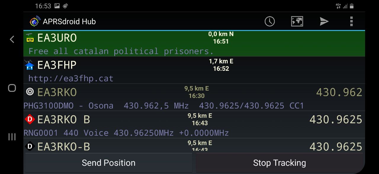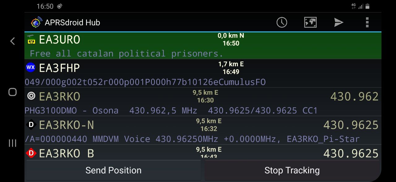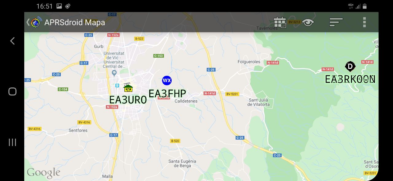 EA3FHP (radioaficionat i estació meteorològica) i EA3URO (Unió de Radioafeccionats d’Osona) emetent amb el mode digital APRS (Automatic Position Reporting System) via ràdio a 144.800 Mhz. amb l’equip KENWOOD TM-D700 i via Internet amb el programa CUMULUS (estació meteorològica) i amb l’app APRSdroid.