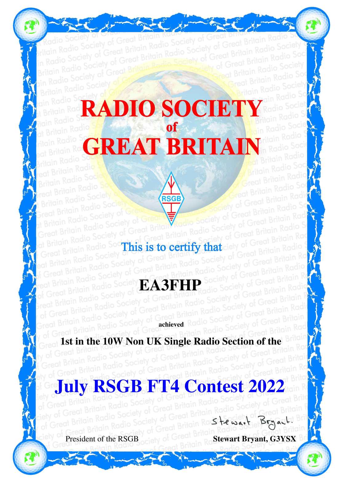 EA3FHP campió del RSGB FT4 Contest Diploma atorgat a EA3FHP. Campió del concurs RSGB FT4 Contest July 2022. Relacionats Radioaficionats