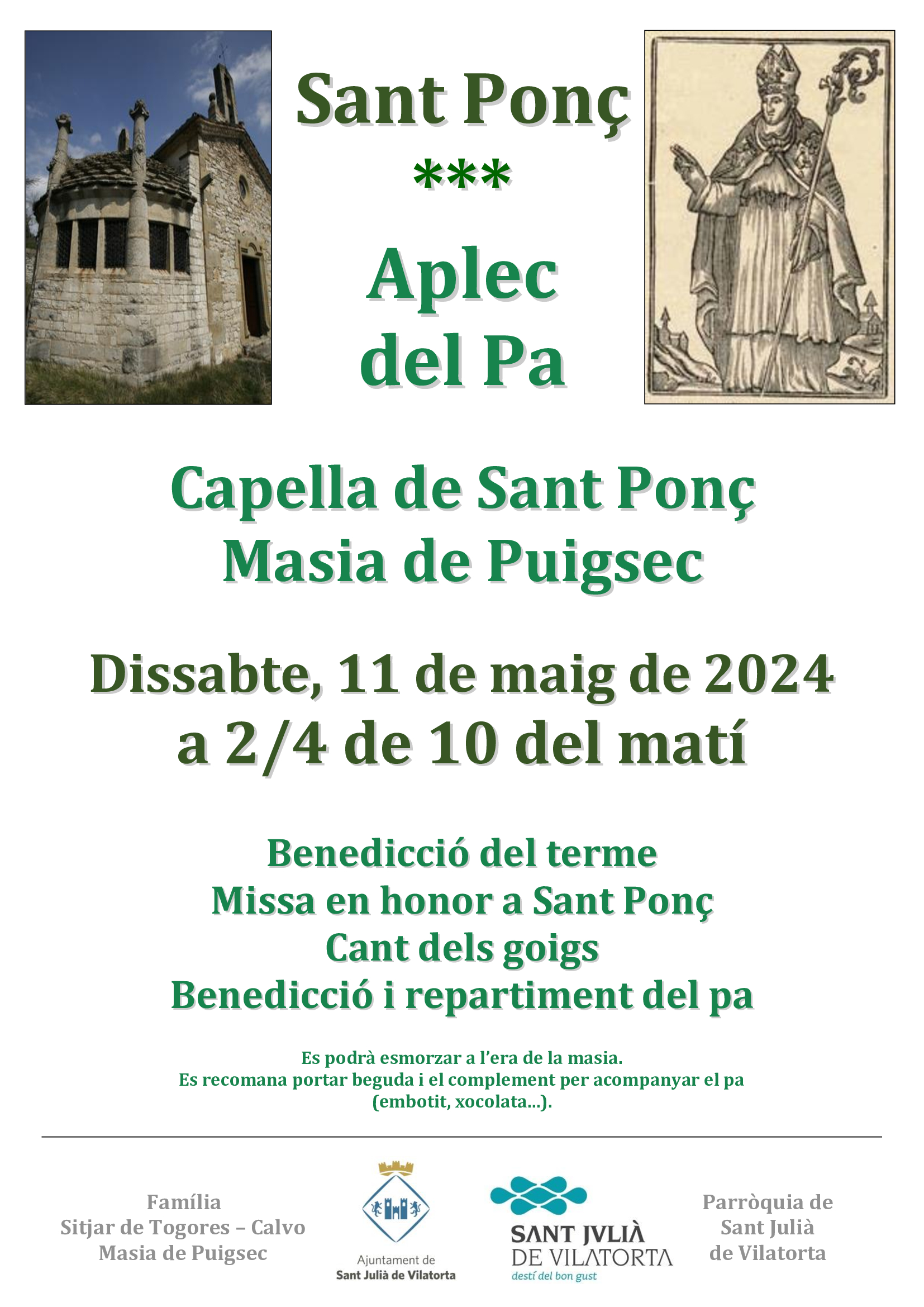 Dissabte, 11 de maig de 2024 a dos quarts de deu del matí: Aplec del Pa. Capella de Sant Ponç i Masia de Puigsec de Sant Julià de Vilatorta.