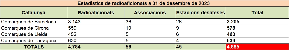 Actualitzada el 31 de desembre de 2023. En aquesta data, a Catalunya hi havia un total de 4.885 autoritzacions, de les quals, 4.784 són radioaficionats, 56 són associacions i 45 són estacions desateses.