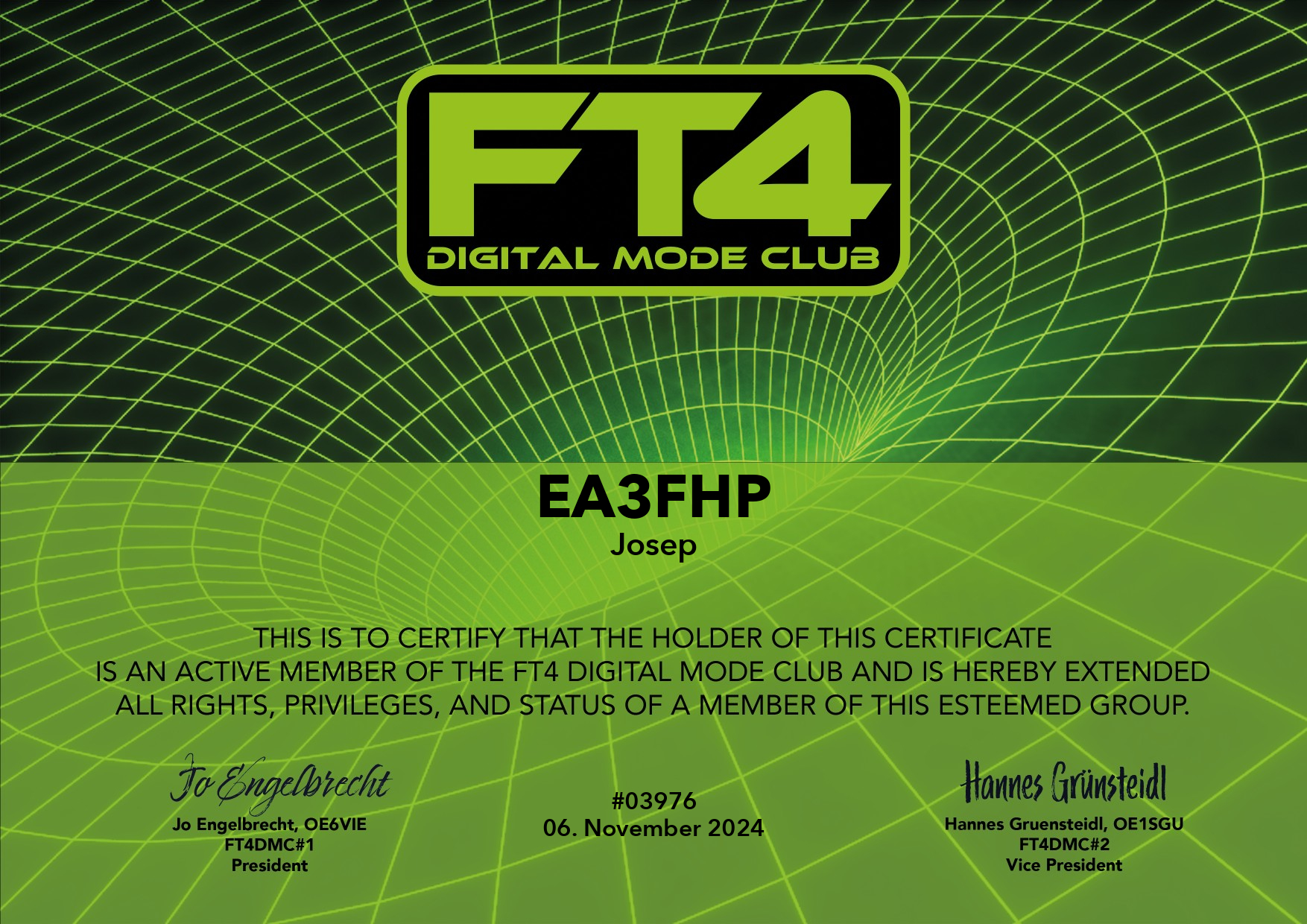 FT4 Digital Mode Club Diploma atorgat a EA3FHP com a soci número 03976 de l’FT4 Digital Mode Club. Relacionats Radioaficionats