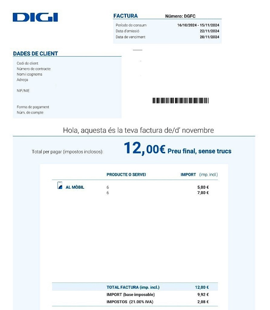 Factura en català de DIGI