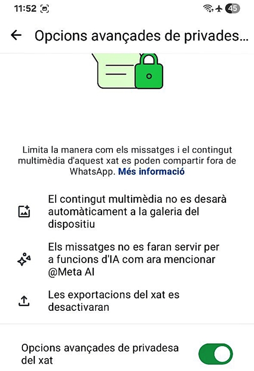 🔐 Si no s’activen, els sistemes d’IA poden accedir il·legalment a tots els missatges de xat grupal, als números de telèfon dels membres i fins i tot a les dades personals emmagatzemades als telèfons. Això també inclou xats 1 a 1!