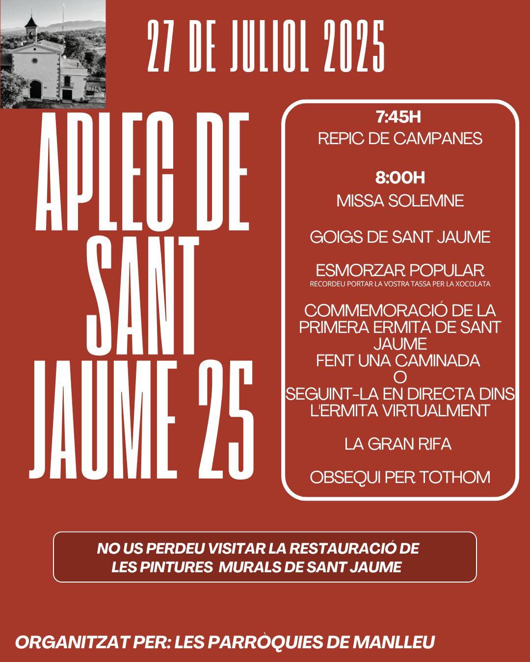 Aplec de Sant Jaume a l’ermita Sant Jaume de Vilamontà de Manlleu. Diumenge, 27 de juliol de 2025. Commemoració de la primera Ermita de Sant Jaume fent una caminada o seguint-la en directe dins l’ermita virtualment.