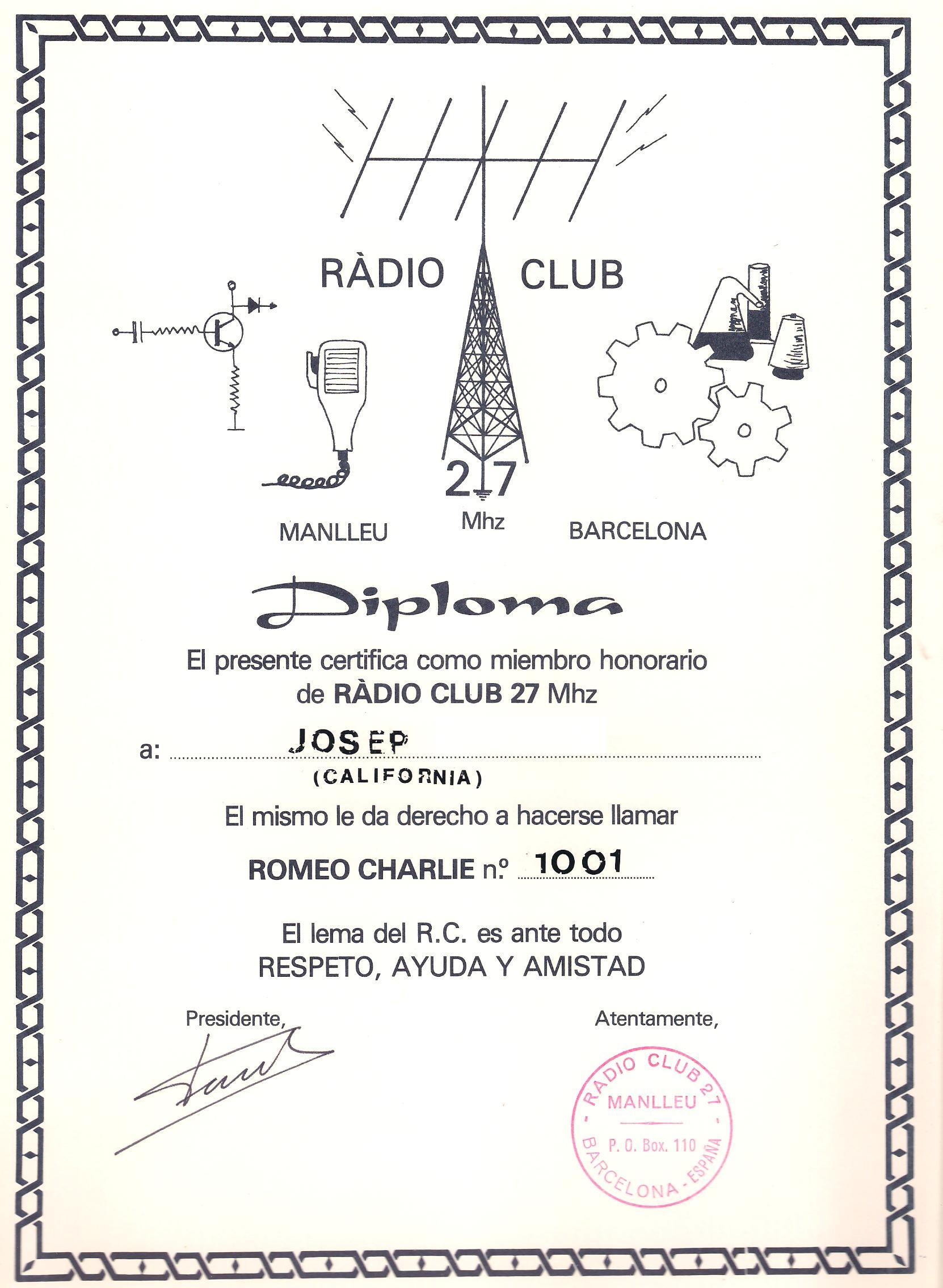Associació de Radioaficionats Vall del Ges Document històric. Diploma de l’Associació de Radioaficionats Vall del Ges.