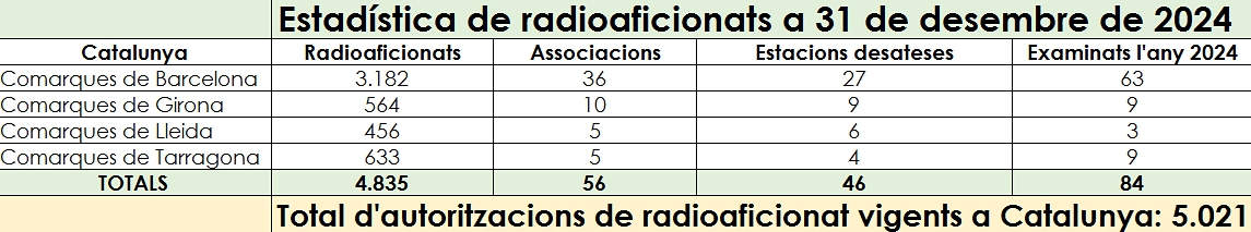 Estadística actualitzada el 31 de desembre de 2024. En aquesta data, a Catalunya hi havia un total de 5.021 autoritzacions, de les quals, 4.835 són radioaficionats, 56 són associacions i 46 són estacions desateses. En un any (2023-2024) hi ha hagut un increment de 51 radioaficionats nous.