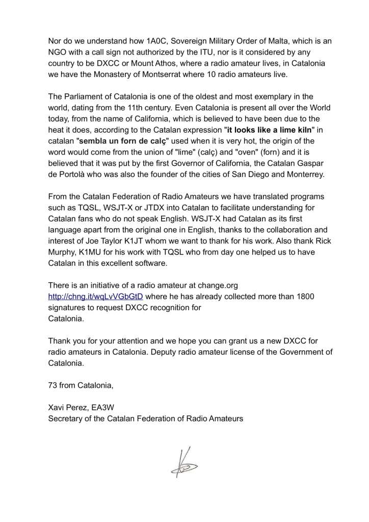 Federació Catalana de Radioaficionats (EA3W) (2) Carta enviada a l’American Radio Relay League (ARRL) per EA3W, Xavi Pérez