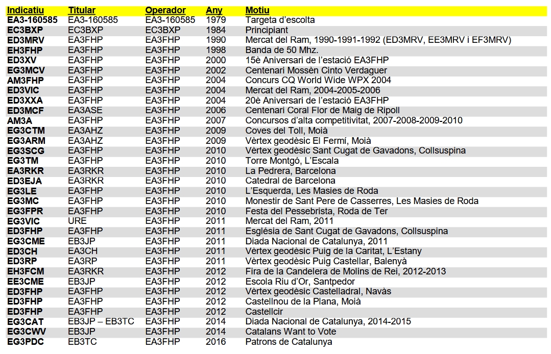 Indicatius especials i temporals de l’estació EA3FHP els quals n’ha sigut titular i/o operador. (Dades actualitzades el divendres 29 d’abril de 2016)
