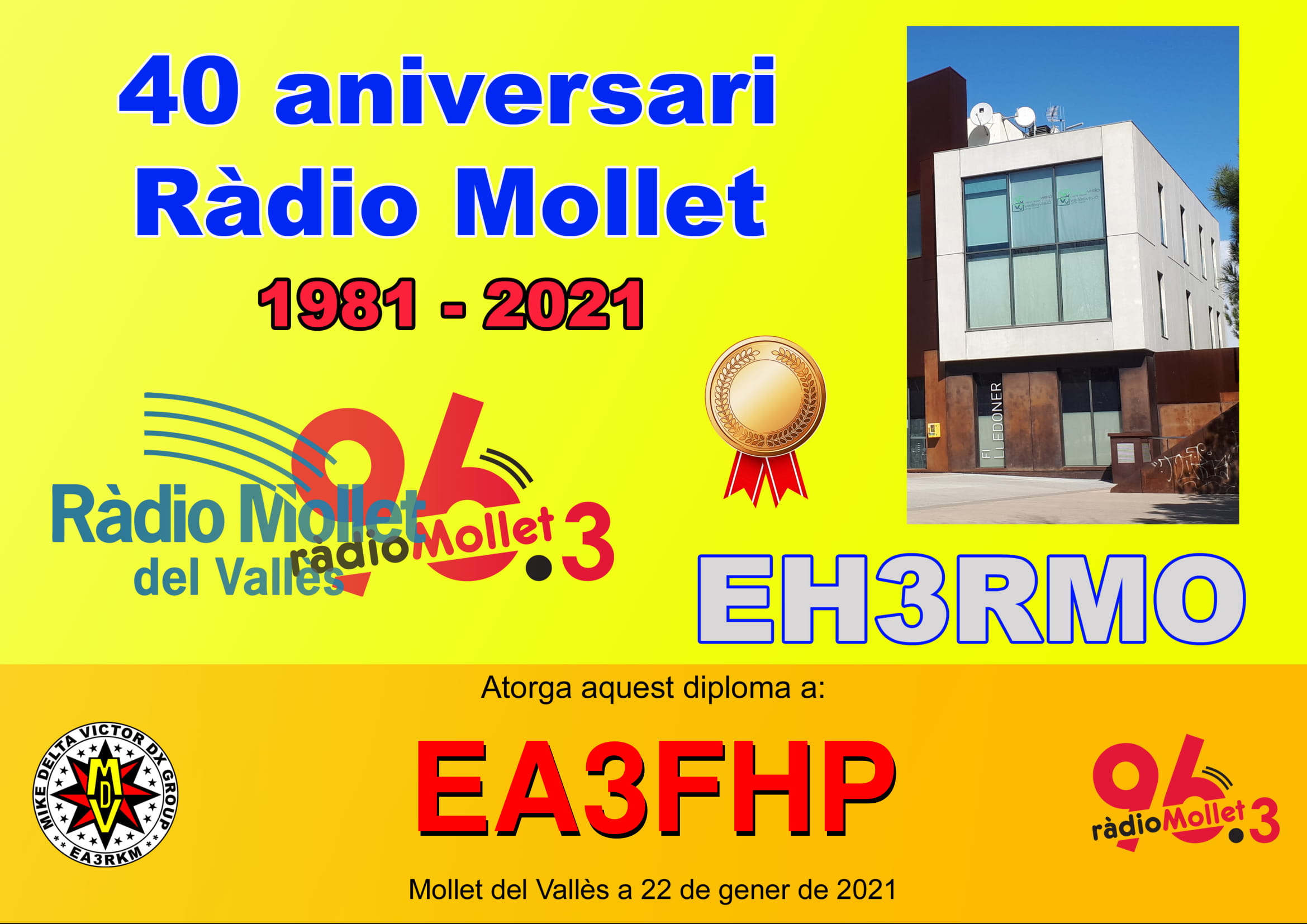 Diplomes EH3RMO Diploma EH3RMO (40è aniversari de Ràdio Mollet) atorgat a EA3FHP. EH3RMO (40è aniversari de Ràdio Mollet)